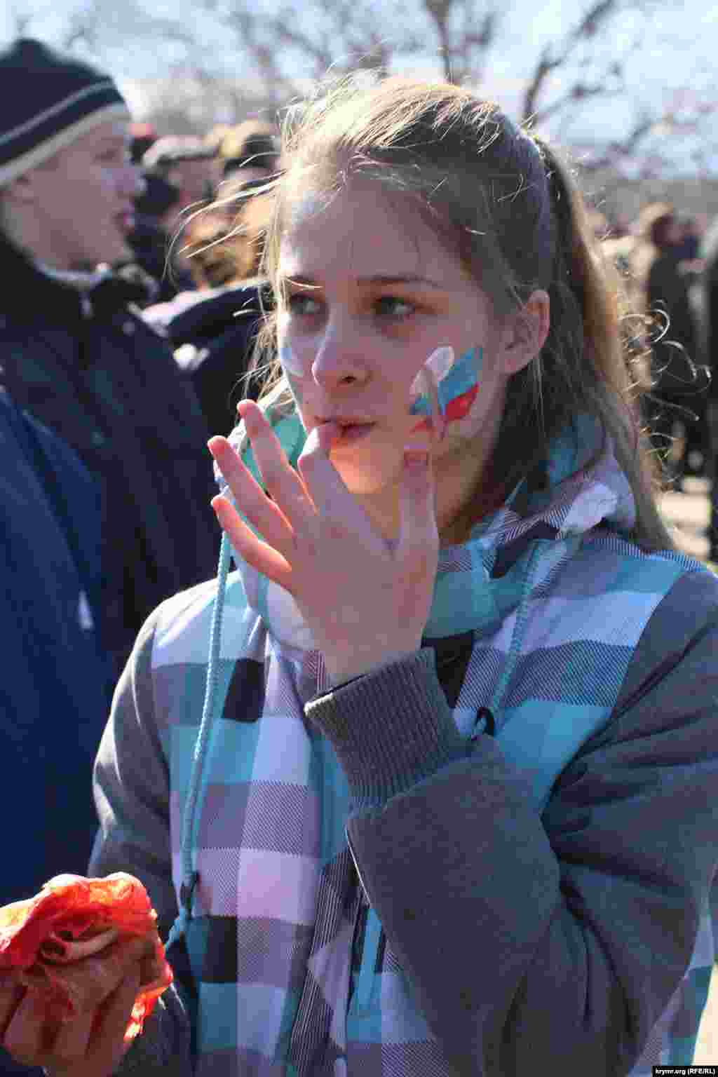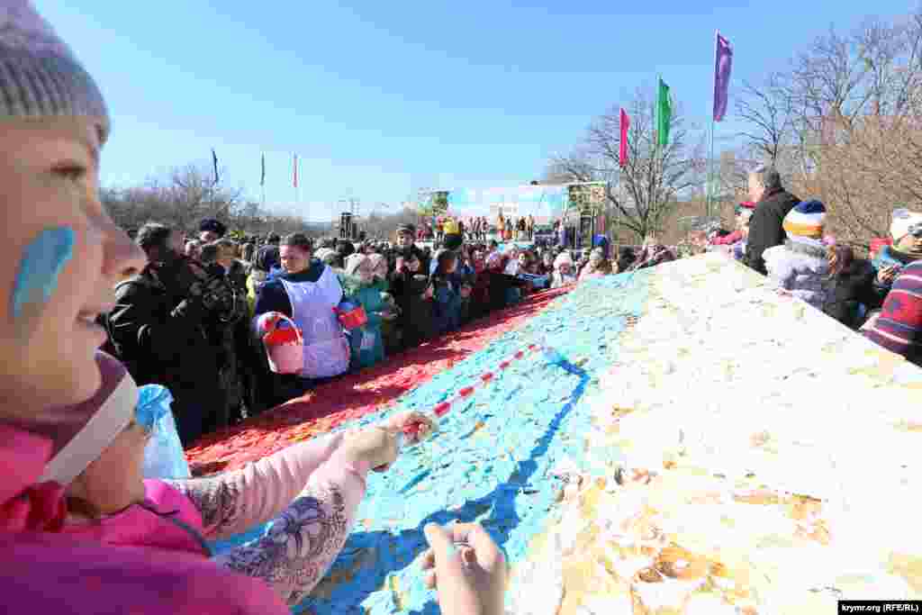 Флаг, размером 2,5 на 5,5 метра раскрашивали все желающие. Самый большой российский триколор, выложенный из блинов и политый сметаной трех цветов был съеден в считанные минуты.