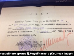 О том, что его дед похоронен в одной из расстрельных ям Сандармоха, Даниил Коцюбинский и его родные узнали в 1997 году: в то лето, когда исследователи Ирина Флиге и Вениамин Иофе вместе с Юрием Дмитриевым нашли полигон, Даниил проезжал через Сандармох с группой журналистов в рамках тура по Беломорканалу на Соловки.